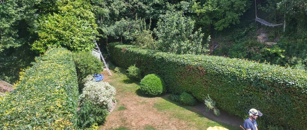 Longer hedges take more time to trim, and taller hedges may require ladders, scaffolding, or pole saws. Both increase labour and safety considerations.